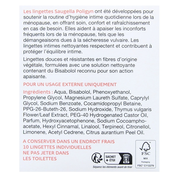 Les lingettes Poligyn de Saugella se destinent aux femmes soucieuses de leur hygiène intime, en particulier celles en période de ménopause. Grâce à leurs propriétés adoucissantes, elles permettent de réduire les inconforts tout en assurant une hygiène parfaite.