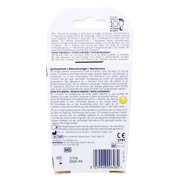 Disponible en boîte de 5 pansements ampoules talon, grand format.