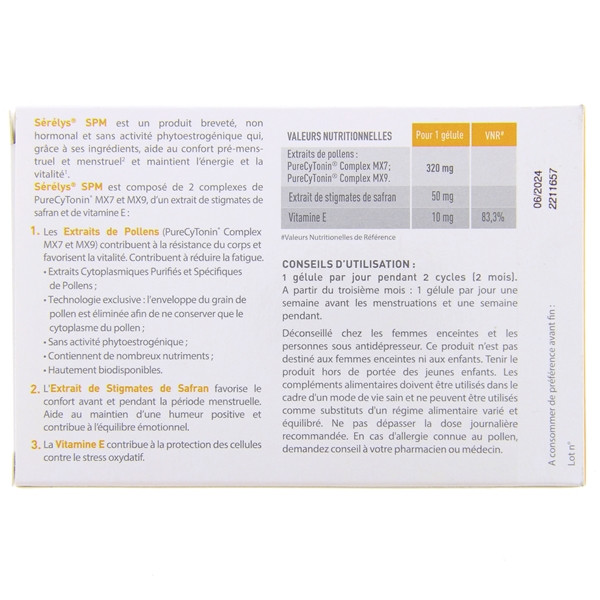 Sérélys SPM Confort Prémenstruel et Menstruel est un complément alimentaire qui maintient une humeur positive, contribue à l'équilibre émotionnel et favorise la vitalité.