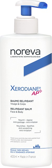 Le baume nutritif relipidant Xerodiane AP Plus de Noreva, disponible en flacon de 400 ml, pénètre immédiatement, ne laissant ni film gras ni collant sur l'épiderme. Ce soin est formulé à base du système Aquaperfus, permettant de garder un taux d’hydratation optimale le plus longtemps possible.