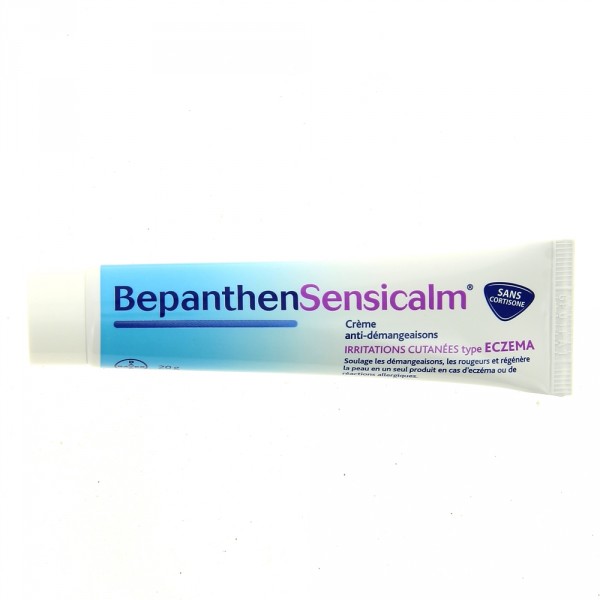 BepanthenSensicalm®, une crème anti-démangeaisons pour les irritations cutanées comme l’eczéma. BepanthenSensicalm soulage les démangeaisons, les rougeurs et régénère la peau en un seul produit en cas d'eczéma ou de réactions allergiques. BepanthenSensicalm est un dispositif médical disponible en tube de 20 grammes.