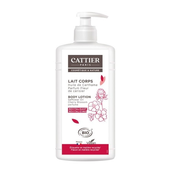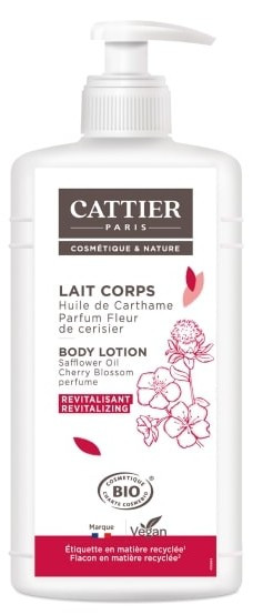 Le Lait pour le corps revitalisant à l'huile de Carthame et au parfum fleur de cerisier de la marque Cattier est certifié bio. Ce lait revitalisant contribue à hydrater et à revitaliser l'épiderme.