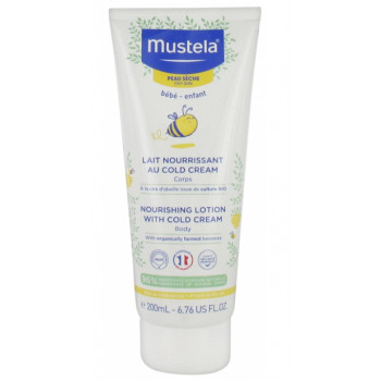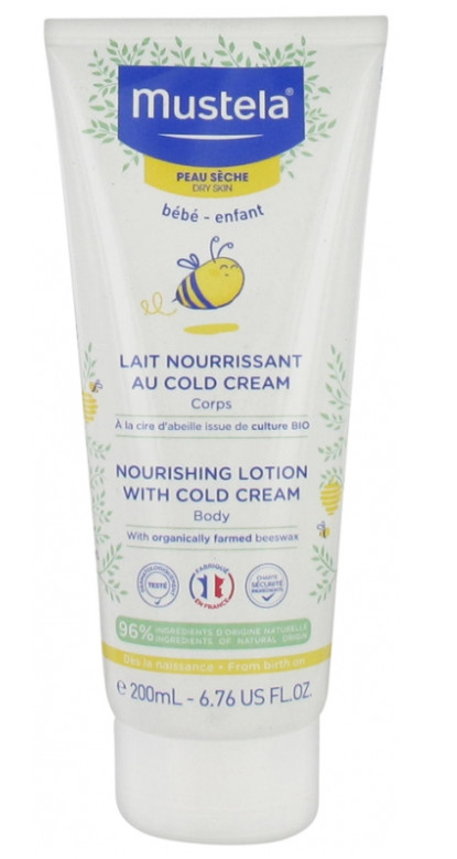 Le lait au cold cream pour l'enfant dès la naissance proposé par la marque Mustela est un lait pour le corps des enfants. Le Perséose d'Avocat, un actif breveté, contenu dans ce lait apporte à la peau les éléments nécessaires pour la préservation de la richesse cellulaire et la protection de la barrière cutanée. Il hydrate également la peau. Ce lait contient aussi des huiles végétales sources d'acides gras qui nourrissent la peau. Les céramides et le cold cream portent leur action sur la restauration et la protection du film hydrolipidique.