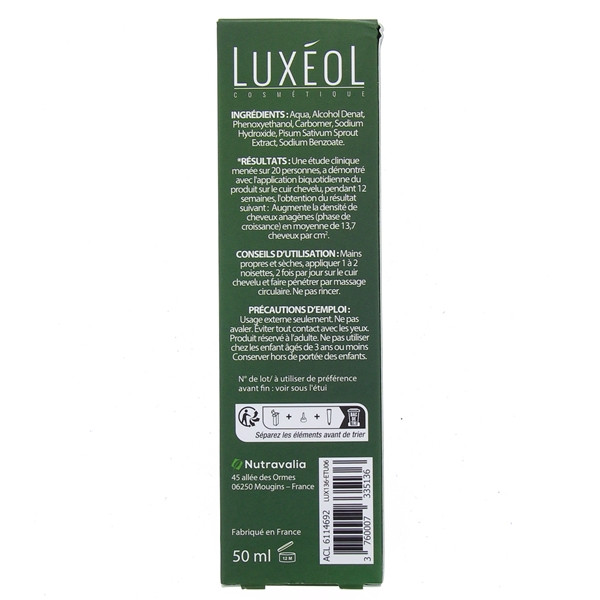 Le sérum pousse de Luxéol est un produit de soin capillaire destiné aux cheveux sujets à un ralentissement de la croissance. Il stimule et accélère la pousse capillaire en réactivant plus de 7 917 cheveux à leur phase de développement. D’efficacité cliniquement prouvée, il s’agit d’un produit de fabrication française avec une contenance de 50 ml et un conditionnement en tube applicateur.