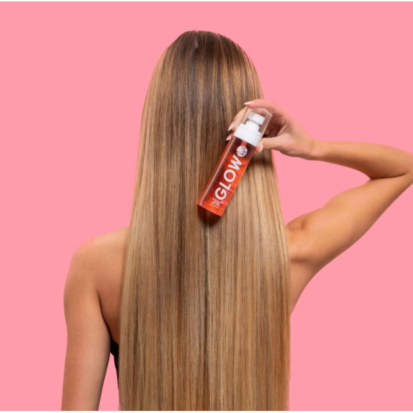 - Sur le cuir chevelu humide, appliquer quelques pression du spray Glow sur les racines.