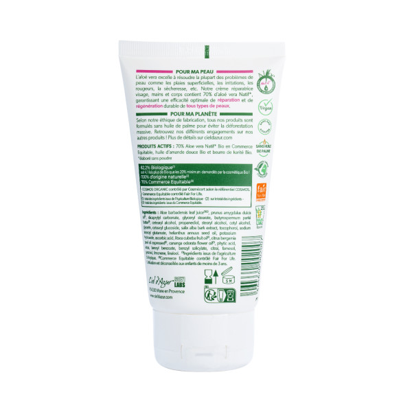 La crème réparatrice bio appartenant à la gamme Pur Aloé de la marque Ciel d'Azur Labs contient 70 % d'aloé vera natif, bio et équitable. Elle est indiquée pour réparer, régénérer et hydrater efficacement et durablement tous les types de peau du visage, du corps et des mains.