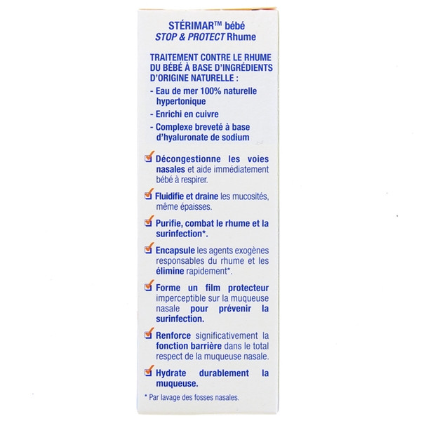 Stérimar Bébé Stop & Protect Rhume est formulé avec de l'eau de mer 100 % naturelle pour combattre et prévenir la surinfection nasale, décongestionner immédiatement et aider bébé à respirer.