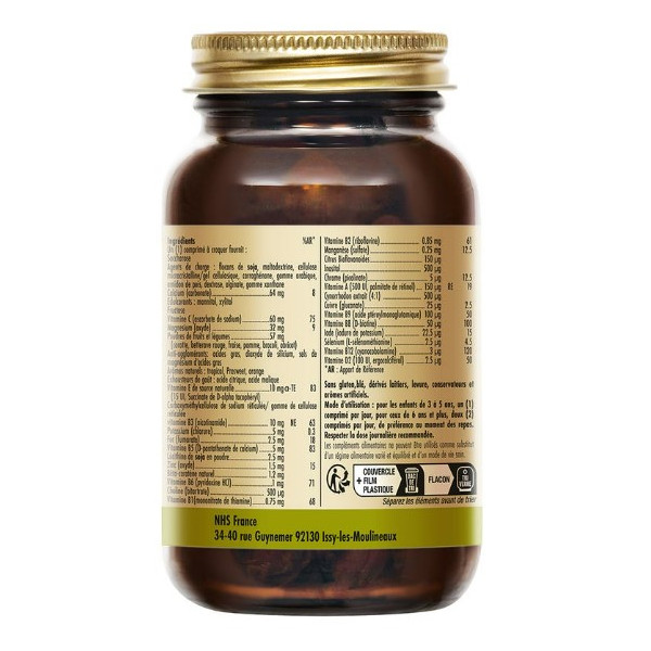 Vitamine A (1,4mg) – vitamine C (60mg) – vitamine D (2,5µg) – vitamine E (10mg) – thiamin (B1 0,75mg) – riboflavine (0,85mg) – niacine (10mg) – vitamine B6 (1mg) – acide folique (100g) – vitamine B12 3µg – magnésium (32mg) – fer (2.5mg) – calcium (5mg) – biotine (50µg) – acide pantothénique – chrome (5µg) – manganèse (250µg) – cuivre (25µg) – sélénium (2,5µg) – zinc (1,5mg) – molybdenum potassium choline (500µg) – vitamine B3 (10mg) – vitamine B5 (5mg) – bêta-carotène naturel (1,2mg) – vitamine B2 (0,85mg) – vitamine B1 (0,75mg) – complexe de bioflavonoïdes d’agrumes (150µg) – inositol (500µg) – extrait de poudre de cynorrhodon (500µg) – chrome (5µg) – iode (22,5µg) – sélénium (2,5µg).
