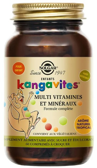 Kangavites Enfants Arôme Tropical de la marque Solgar est un complément alimentaire pour les enfants qui contient 22 vitamines et minéraux pour contribuer à la croissance et à un développement osseux normaux. De plus, il participe au bon fonctionnement du système immunitaire et au développement cognitif.