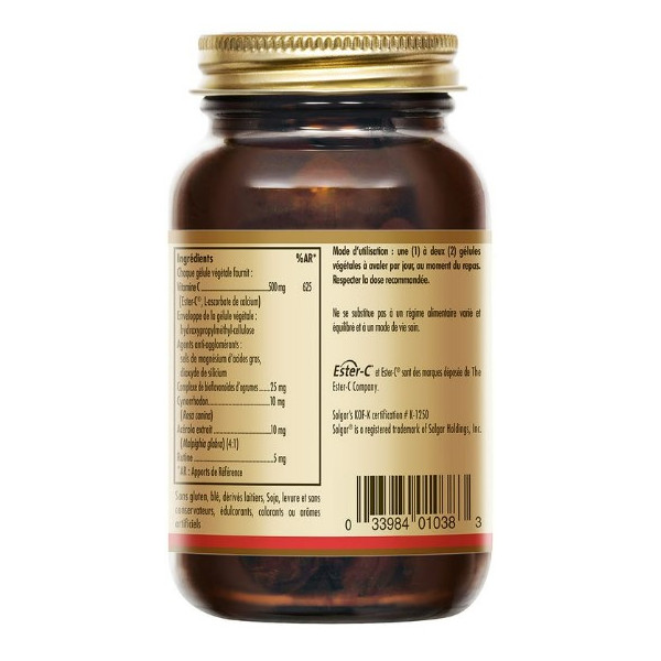 L’Ester-C Plus 500 mg renferme également des métabolites de la vitamine C existant dans la nature. La fabrication de ce complément de vitamine C Solgar a suivi un procédé spécial afin de former un complexe d’ascorbate de calcium et de métabolites. En plus de l’acérola, il contient aussi un complexe de bioflavonoïdes d’agrumes, de la rutine et du cynorrhodon.