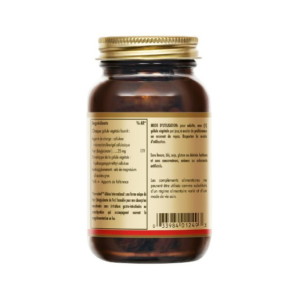 Solgar Fer Doux est un complément alimentaire qui comble efficacement les défauts d’apport en fer dans l’organisme. Chaque gélule contient du fer doux, sous forme de Bisglycinate de fer.
