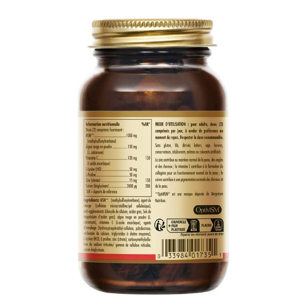 Peau Ongles Cheveux Solgar est un complément alimentaire embarquant une formule efficace et complète. Il a été spécialement conçu à base de nutriments essentiels qui contribuent à maintenir la beauté de la peau, des cheveux et des ongles. Cette supplémentation de la marque Solgar est composée de :