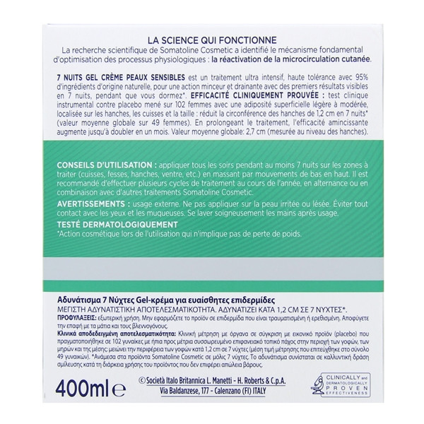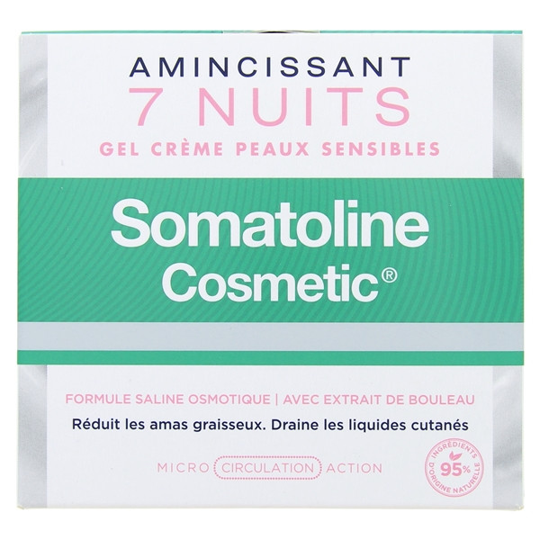 - Appliquer le soin Amincissant 7 Nuits Natural Gel Crème Peaux sensibles Somatoline chaque soir durant 7 nuits au moins sur les zones ciblées (ventre, hanches, fesses, cuisses, etc.) en massant avec des mouvements de bas en haut.