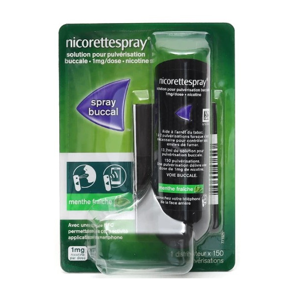 Disponible en boîte de 1 spray. Le spray Nicorette est une aide à l'arrêt de la consommation du tabac. Prendre un ou deux doses du spray Nicorette quand l'envie de fumer se fait sentir. 1 mg de nicotine est délivré à chaque pulvérisation. Le spray Nicorette contient 150 pulvérisations.