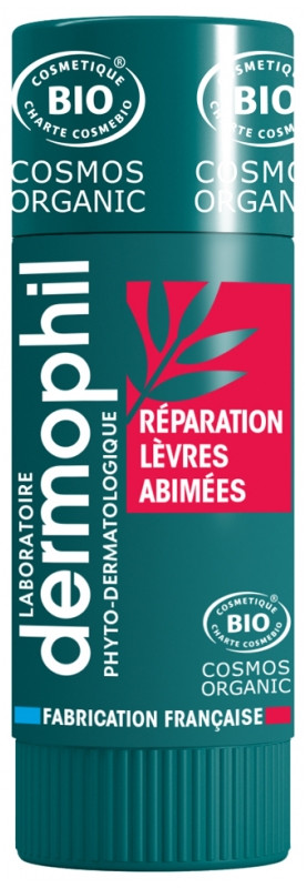 Stick à lèvres Dermophil Réparation lèvres abimées, développé avec des ingrédients issus de l'agriculture biologique, à base de Pin Cembro et de Centella, à action apaisante, réparatrice et émolliente, permettant de protéger la muqueuse labiale des agressions extérieures (soleil, vent, froid…).