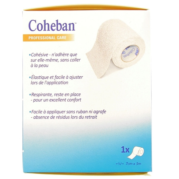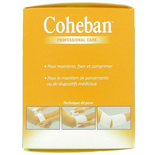 La bande Coheban, spéciale pour la contention, des laboratoires 3M, est facile à appliquer grâce à son élasticité. Elle s'utilise pour maintenir les membres et compresser l'œdème associé ainsi que pour maintenir des pansements ou dispositifs médicaux. Conditionné dans une boîte contenant une bande de couleur blanche de 7 cm x 3 m.