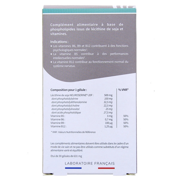Lécithine de soja IP (Identité Préservée) NEUROSERINE®-20F dosée en phospholipides, tunique : gélatine de peau de poisson, humectant : huile de tournesol, antioxydant : vitamine E (D-alpha tocophérol) d’origine naturelle, vitamine B5 (pantothénate de calcium), vitamine B12 (cyanocobalamine), vitamine B6 (chlorhydrate de pyridoxine), vitamine B9 (acide folique).