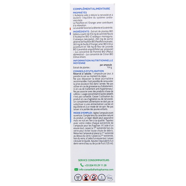 Extrait de plantes BIO [obtenu à partir de 416 mg de sommité fleurie d’Aubépine BIO (Crataegus monogyna, Crataegus laevigata), 263 mg de partie aérienne de Passiflore BIO (Passiflora incarnata), 263 mg de feuille d’Oranger amer BIO (Citrus aurantium) et 106 mg de fleur de Lavande BIO (Lavandula angustifolia) par ampoule] – Jus concentré de Pomme BIO (Malus domestica) – Jus concentré de Citron BIO (Citrus limon).