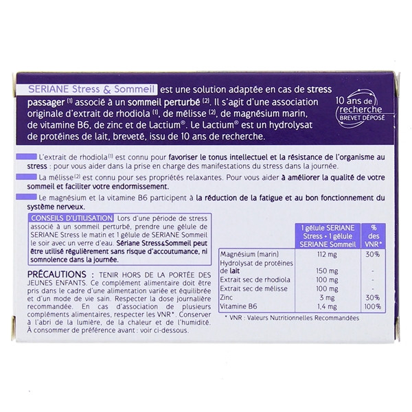 - Sériane Stress : Oxyde de magnésium marin, Extrait de rhodiola, Gélatine : Hydrolysat de protéine de lait (Lactium®), Agent de charge : Cellulose microcristalline, Citrate de zinc, Antiagglomérant : Stéarate de magnésium, Vitamine B6.