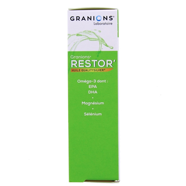 Produits de la marque Granions, les granions Restor' Huile Qualitysilver sont indiqués pour le bon fonctionnement cérébral et pour la réduction de la fatigue.