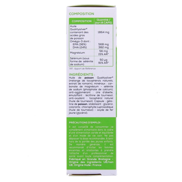 Huile de poisson Qualitysilver® (mélange de tocophérols naturels, Extrait de romarin), Minéraux : Carbonate de magnésium, Sélénite de sodium (Phosphate de calcium), Anti-agglomérants : Cire d'abeille, Émulsifiant : Lécithine de tournesol, Anti-oxydant : Tocophérol naturel (Huile de tournesol).