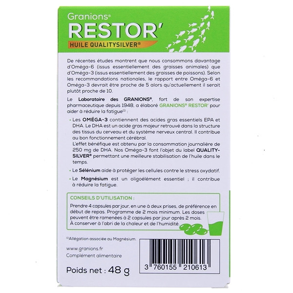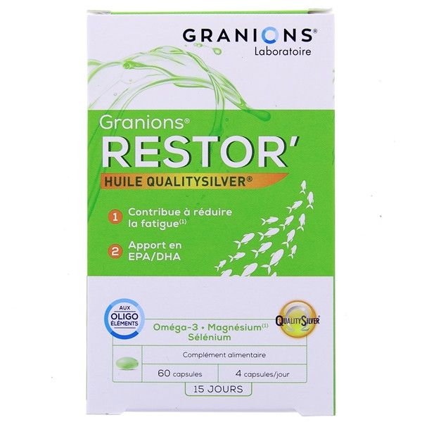 Les granions Restor' sont formulés avec des Oméga-3 labélisés Huile Qualitysilver, du sélénium et du magnésium pour contribuer à réduire la fatigue et pour contribuer au bon fonctionnement cérébral.
