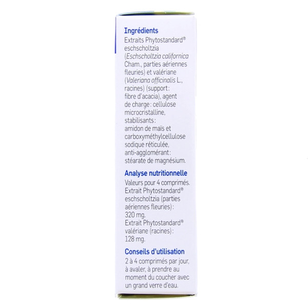 Extraits Phytostandard® eschscholtzia (Eschscholtzia californica Cham., parties aériennes fleuries) et valériane (Valeriana officinalis L., racines) (support : fibre d’acacia), agent de charge : cellulose microcristalline, stabilisants : amidon de maïs et carboxyméthylcellulose sodique réticulée, anti-agglomérants : sels de magnésium d'acides gras.