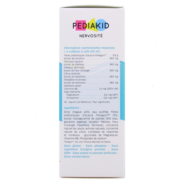 Le complément alimentaire « Nervosité » de la gamme PEDIAKID des laboratoires INELDEA est conçu spécialement pour les enfants. Les actifs majeurs des extraits naturels des plantes présents dans cette formule permettent de lutter contre les troubles du sommeil, le stress, la nervosité et même l'hyperactivité chez l'enfant. Le complément alimentaire PEDIAKID « Nervosité » favorise la relaxation et l'apaisement. Grâce à sa formule relaxante, le complément nutritionnel PEDIAKID « Nervosité » permet de lutter contre la fatigue qui favorise la nervosité et le stress.
