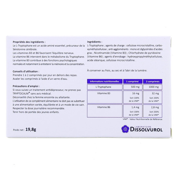 Choisissez le complément nutritionnel Tryptocalm du laboratoire Dissolvurol, composé de tryptophane et de L-tryptophane, pour équilibrer votre humeur. Les Vitamines B3 et B6 sont bénéfiques à l’équilibre nerveux.