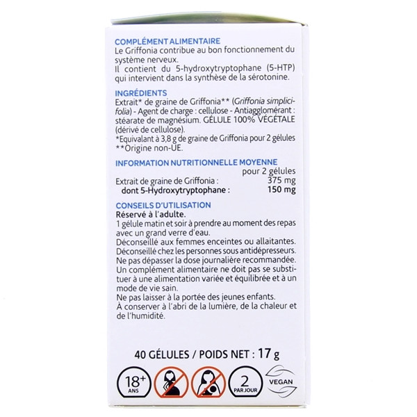 Les laboratoires Arkopharma développent le complément alimentaire Arkogélules Griffonia, conditionné dans une boîte de 40 gélules.