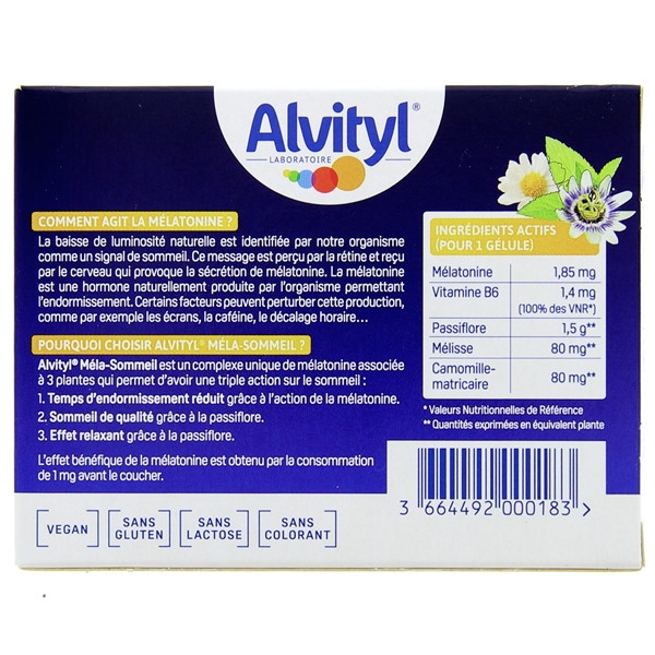 Chaque gélule d’Alvityl® Méla-Sommeil jouit d’une triple action. Elles agissent sur l’endormissement, la relaxation ainsi que sur la qualité du sommeil. Elles doivent cela à leur composition associant l’effet de 3 plantes et de la mélatonine.