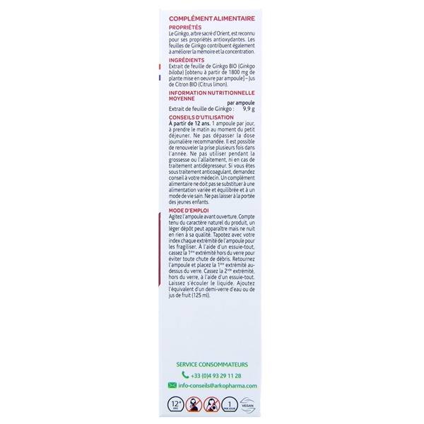 Extrait de feuille de ginkgo Bio (Ginkgo biloba) [obtenu à partir de 1,8 g de plante mise en œuvre par ampoule], Jus de citron* (Citrus limon).