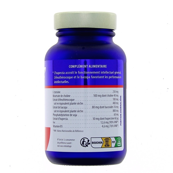 Lécithine de soja titrée en phosphatidylsérine – Enveloppe de la gélule : gélatine marine (poisson), colorant : chlorophylline – L-tyrosine – Bitartrate de choline – Extrait de racine d’éleuthérocoque (Eleutherococcus senticosus) – Extrait de plante de bacopa (Bacopa monnieri) titré en bacosides – Bisglycinate de fer – Extrait de partie aérienne d’Huperzia serrata titré en huperzine – Anti-agglomérant : sels de magnésium d’acides gras – D-pantothénate de calcium (vitamine B5).