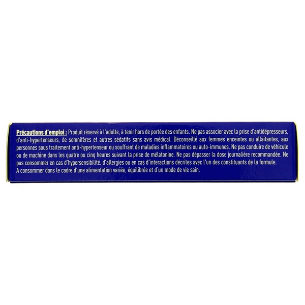 Produit réservé à l’adulte de plus de 18 ans. A tenir hors de portée des enfants. Ne pas associer avec la prise d’antidépresseurs, d’anti-hypertenseurs, de somnifères et autres sédatifs sans avis médical. Déconseillé aux femmes enceintes et allaitantes. Ne pas conduire de véhicule ou de machine dans les quatre ou cinq heures suivant la prise de mélatonine. Ne pas dépasser la dose journalière recommandée. Ne pas consommer en cas d’hypersensibilité, d’allergies ou en cas d’interactions décrites avec l’un des constituants de la formule. A consommer en complément d’une alimentation variée et équilibrée et d’un mode de vie sain.