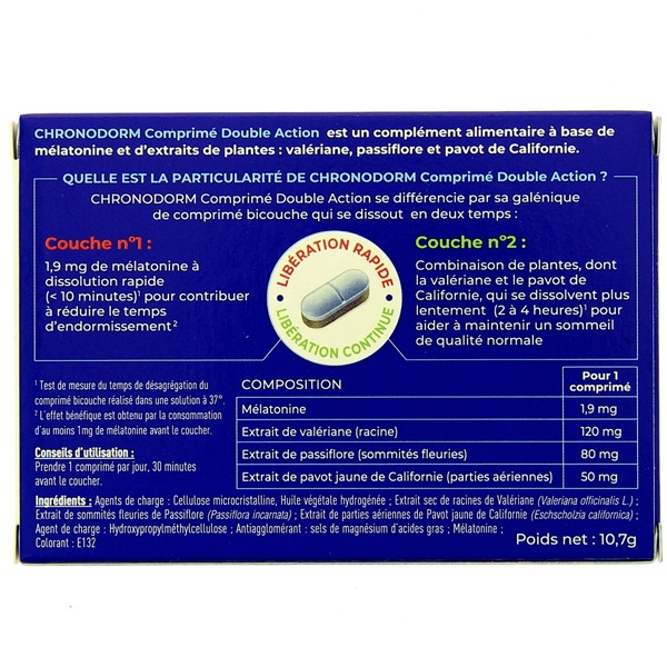 Chronodorm Comprimé Double Action, est un complément alimentaire à base de mélatonine et d’extraits de plantes (Valériane, Passiflore, Pavot de Californie), qui va venir vous aider à lutter contre la difficulté d'endormissement ainsi que contre les réveils nocturnes.