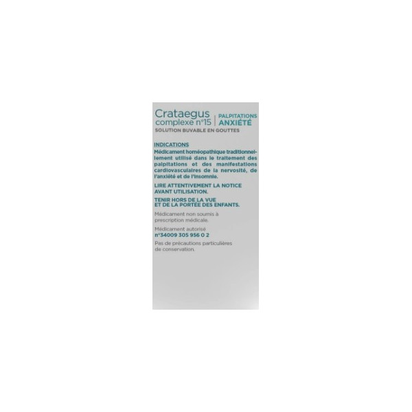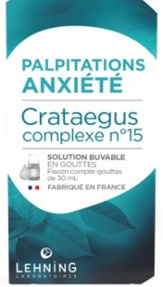 Crataegus complexe n°15 est un médicament homéopathique en solution buvable en gouttes. Il est traditionnellement utilisé dans le traitement des palpitations et des manifestations cardiovasculaires de l'anxiété, de la nervosité et de l'insomnie.
