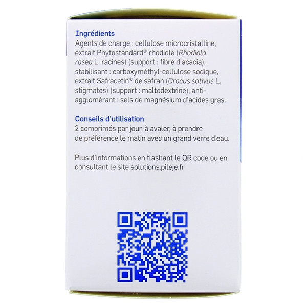 Agents de charge : cellulose microcristalline, extrait Phytostandard® rhodiole (Rhodiola rosea L. racines) (support : fibre d’acacia), stabilisant : carboxyméthyl-cellulose sodique, extrait Safracetin® de safran (Crocus sativus L. stigmates) (support : maltodextrine), anti-agglomérant : sels de magnésium d'acides gras.