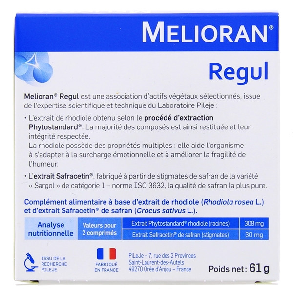 Melioran Regul du laboratoire Pileje est un complément alimentaire formulé à base d'extrait de rhodiole et d'extrait Safracetin de safran pour améliorer l'humeur et le bien-être émotionnel en cas de surcharge émotionnelle et / ou de fragilité de l'humeur.