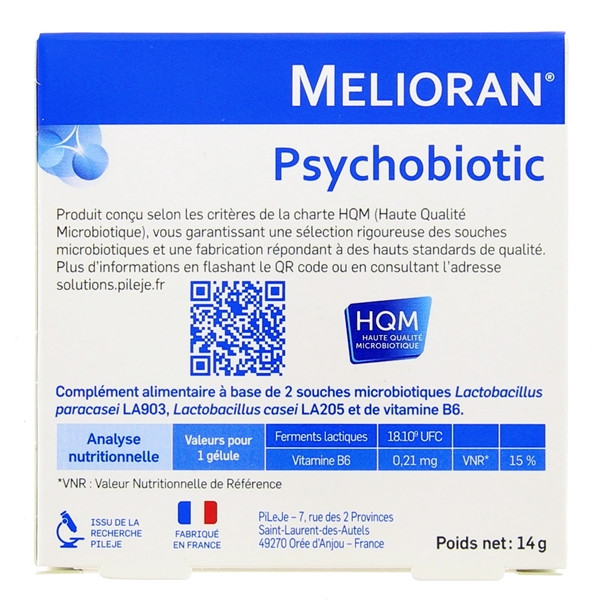 Melioran Psychobiotic du laboratoire Pileje est un complément alimentaire qui contient 2 souches microbiotiques dosées à 18 milliards par gélules et de la vitamine B6 pour contribuer à des fonctions psychologiques normales.