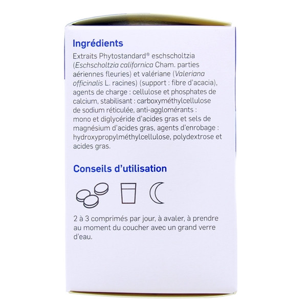Extraits Phytostandard eschscholtzia (Eschscholtzia califonica Cham. parties aériennes fleuries) et valériane (Valeriana officinalis L. racines) (support : fibre d’acacia), agents de charge : cellulose et phosphates de calcium, stabilisant : carboxyméthylcellulose de sodium réticulée, anti-agglomérants : mono et diglycéride d’acides gras et sels de magnésium d’acides gras, agents d’enrobage : hydroxypropylméthylcellulose, polydextrose et acides gras.