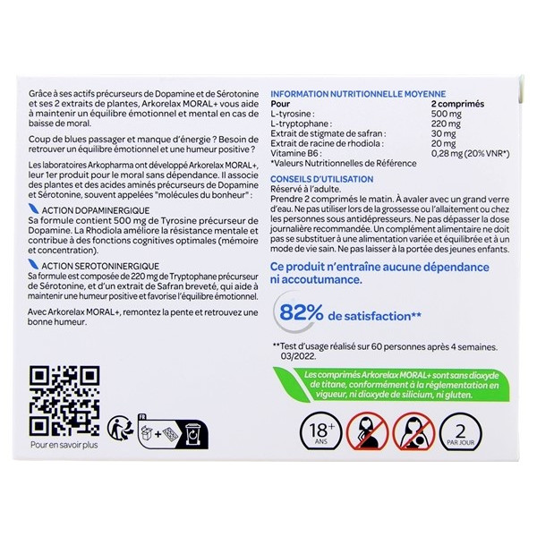 Arkorelax Moral+ est un complément alimentaire formulé à base de deux actifs précurseurs de Dopamine et de Sérotonine, de 2 extraits de plantes et de vitamine B6 pour vous aider à maintenir un équilibre émotionnel et mental en cas de baisse de moral.