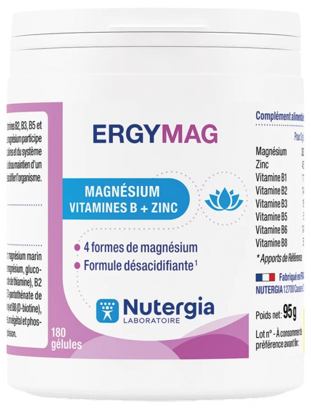 ERGYMAG est riche en magnésium et en vitamines B2, B3, B5 et B6 qui participent à la réduction de la fatigue.