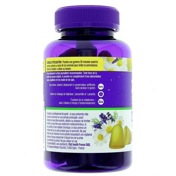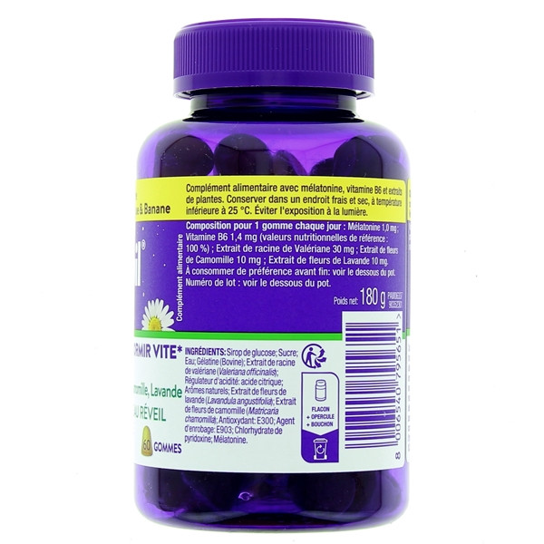 Sirop de glucose ; sucre ; eau ; gélatine (bovine) ; extrait de racine de Valériane (Valeriana Officinalis) ; régulateur d' acidité : acide citrique ; arômes naturels ; extrait de fleurs de Lavande (Lavandula angustifolia) ; extrait de fleurs de Camomille (Matricaria chamomilla) ; anti-oxydant : E300 ; agent d' enrobage : E903 ; chlorhydrate de pyridoxine ; mélatonine.