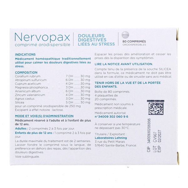 Nervopax est un médicament homéopathique des laboratoires Lehning indiqué pour calmer les douleurs digestives liées au stress.