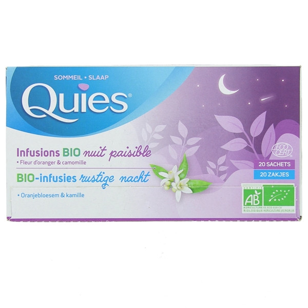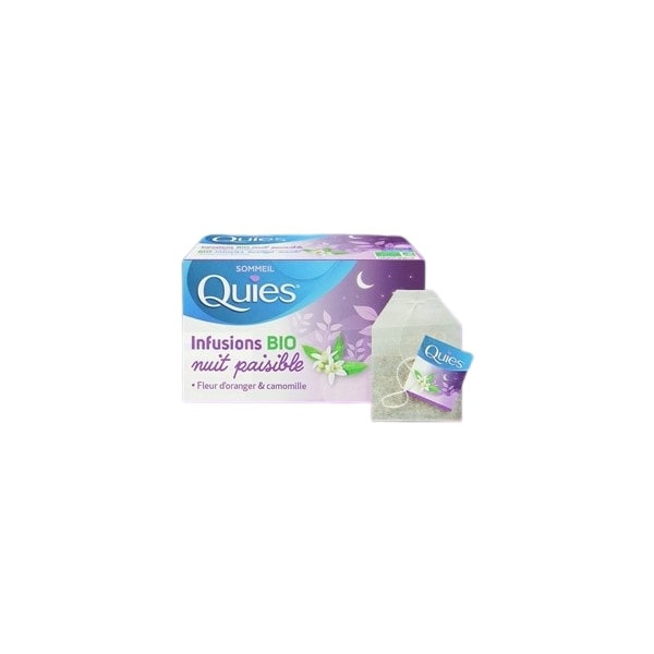 Pour favoriser naturellement la détente et l'endormissement, Quiès a développé la gamme Sommeil avec les infusions Bio nuit paisible. Cette infusion est formulée à base d'une association de plantes dont la fleur d'oranger et la camomille.