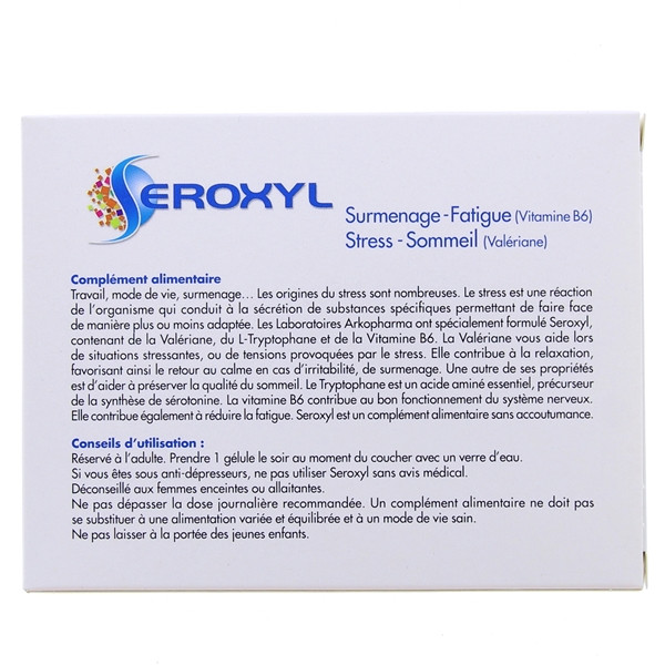 Seroxyl d'Arkopharma est un complément alimentaire formulé à base de L-Tryptophane, de Vitamine B6 et de Valériane. Il est indiqué en cas de surmenage, fatigue, stress et problèmes de sommeils.