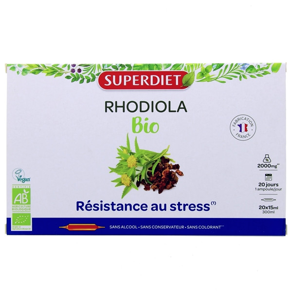 Rhodiola bio est un complément alimentaire conçu par les laboratoires Superdiet. Il s’agit d’un produit formulé sans conservateur, sans colorant et sans alcool. Ces ampoules sont également bios et conviennent parfaitement dans la cadre d’un régime alimentaire végan.