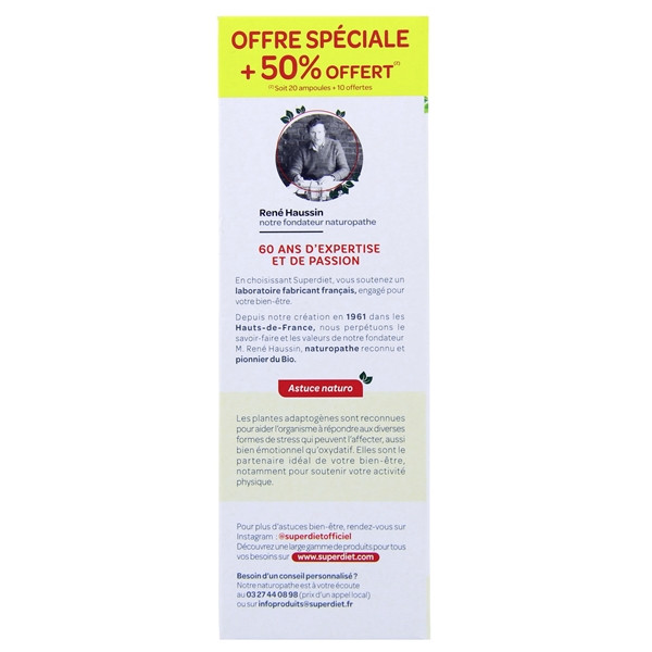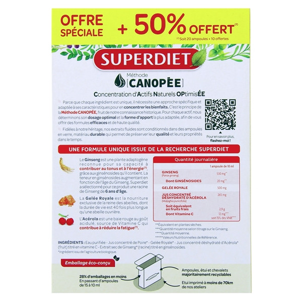 Les ampoules à base de Ginseng, Gelée Royale et Acérola Bio "Booster d'énergie" du laboratoire Superdiet permettent de favoriser le tonus et l'énergie et réduire la fatigue.