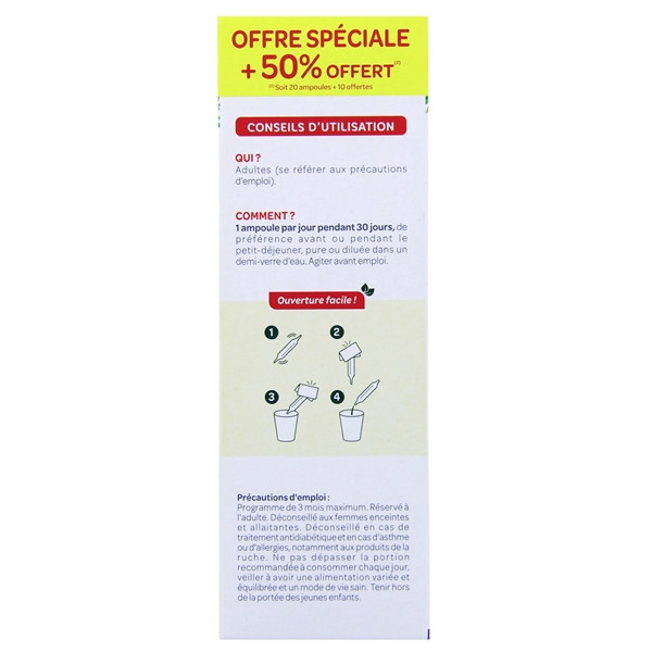 Disponible en boîte de 30 ampoules de 10 ml dont 50 % offertes.