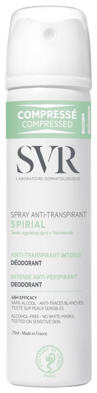 Spirial Spray Anti-transpirant Intense Déodorant est un traitement qui allie douceur et efficacité. Son effet dure 48 heures. Ce produit des laboratoires dermatologiques SVR est destiné à tous les types de peaux en cas de transpiration intense. Testé sous contrôle dermatologique et hypoallergénique, ce soin convient également aux peaux sensibles.